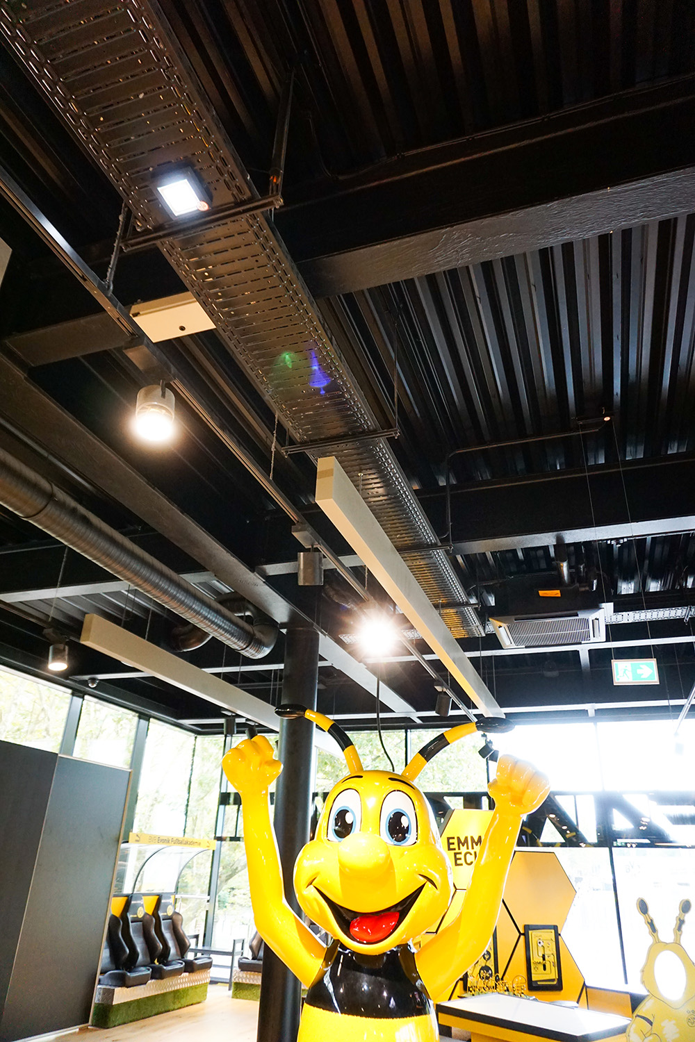 Im Inneren der BVB-FanWelt trifft Holz auf Konstruktionselemente wie Stahl und sichtbare Versorgungsrohre. Das sorgt für einen industriellen Charakter, der zu Dortmund passt und zur OBO BlackLine. Mit den Systemlösungen für schwarze Aufputz-Installationen lassen sich in modernen Architekturprojekten anspruchsvolle Elektroinstallationen realisieren. Zum Portfolio zählen unter anderem Geräteeinbau- und Leitungsführungskanäle, Unterflurlösungen und Kabelrinnen. In der BVB-FanWelt wurden schwarze Kabelrinnen, Hängestiele und passende Formteile gut sichtbar in den Innenräumen installiert, wo sie sich harmonisch in den Industrial Style des Interieurs einfügen.