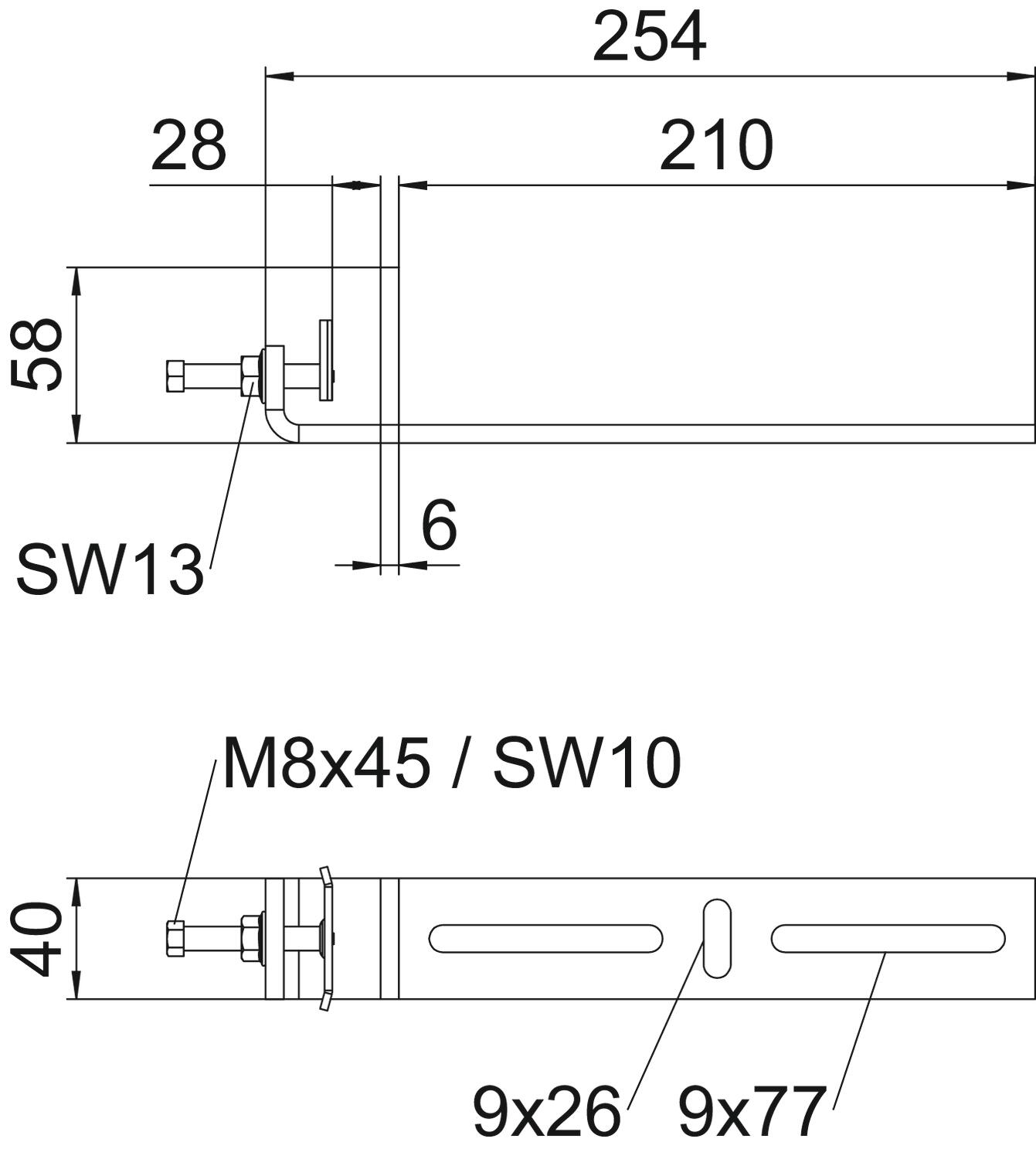 Kõrgus 58 mm Laius 210 mm Materjal Teras Materjali paksus 6 mm Mõõde 254x58x40 Pikkus 248 mm Pinnakate Kuumtsingitud kastmismeetodil Rakendustemperatuuri vahemiku max 120 °C Rakendustemperatuuri vahemiku min -20 °C Roostevaba teras, peitsitud ei Värv tsink - Kõik tüübid