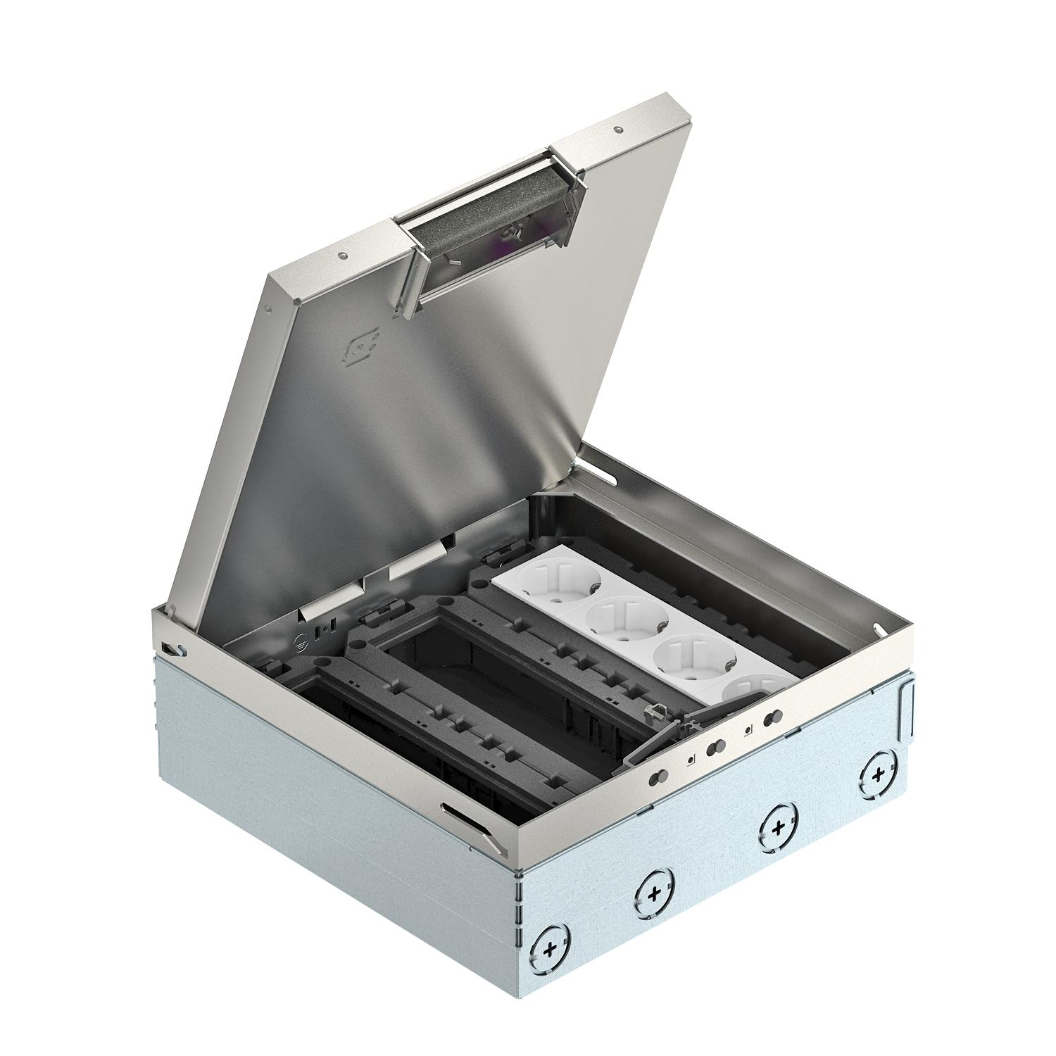 Toote kirjeldusRuudukujuline põrandakarp kasutamiseks sisetingimustes kuivalt hooldatavates õõnes- ja tasanduskihiga põrandates. Põrandakarp eelvormitud sisestusavadega torude (M25) jaoks. 3 universaalkanduriga UT4 ja kahe 2-se kaitsekontakt-pistikupesaga. Ülaosa saab nelja reguleertoe abil põrandakatte ülaserva suhtes reguleerida. Minimaalne paigaldussügavus on 95 mm, reguleervahemik + 30 mm.